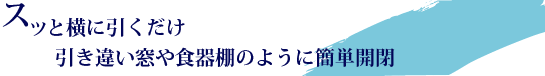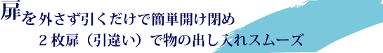 ■扉の取っ手に手をかけ横方向にスライドさせることで開閉を行います。片側ずつしか開けられませんが扉を取り外す事なく開閉ができます。
