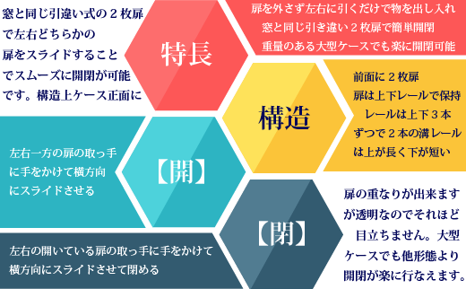 ■構造上正面に扉の重なりが出来ますが大型でも開閉がしやすく場所を取らないため頻繁に開け閉め をする店舗の商品ディスプレイなどに適しています。扉は前面上下にある3本ずつのレールで保持されております。