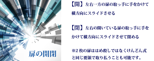 | 扉の開閉 【開】 | 扉の取っ手に手をかけて横方向にスライドさせる | |||