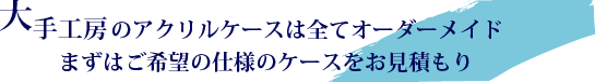 ■【大手工房】のアクリルケースは全てオーダーメイドとなります。ご希望するケースのサイズや形態などにによりお値段が変わってきますのでまずはお見積り依頼をお願い致します。