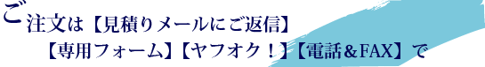 ■ご注文は【見積もりメールにご返信】して頂くか【専用フォーム】に必要事項を記載し送信、【ヤフオク!】の質問欄から送信、【電話/FAX】からお受けしております。年中無休でお受けしております。
